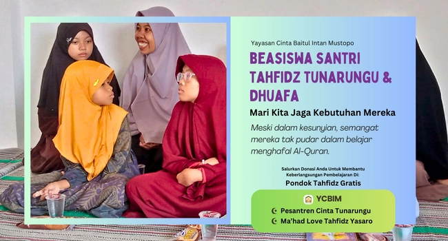 Yayasan Cinta Baitul Intan Mustopo menyelenggarakan pendidikan pesantren tahfidz Al-Qur’an secara gratis, termasuk pesantren khusus bagi santri tunarungu, sebagai wujud komitmen menghadirkan layanan pendidikan yang inklusif, bermartabat, dan berkelanjutan. Seluruh santri dibina tanpa pungutan biaya, dengan dukungan program pembinaan yang terarah dan berkesinambungan.